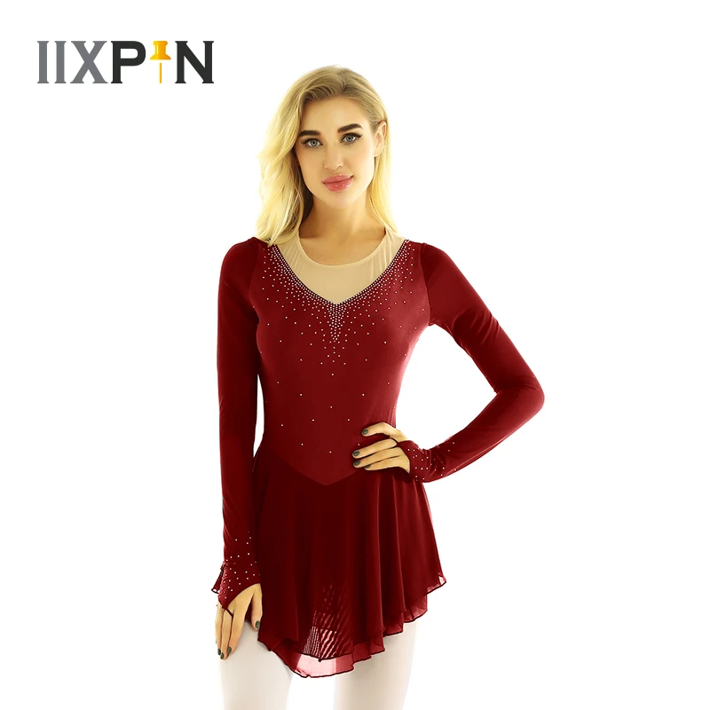 Best Quality Women Shiny Rhinestone Figure Ice Skating Dress Roller Skating Ballet Dance Leotard Dress Round Nec