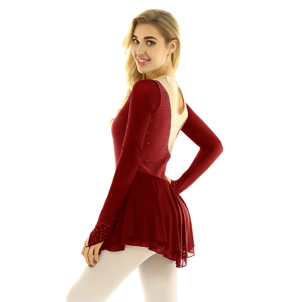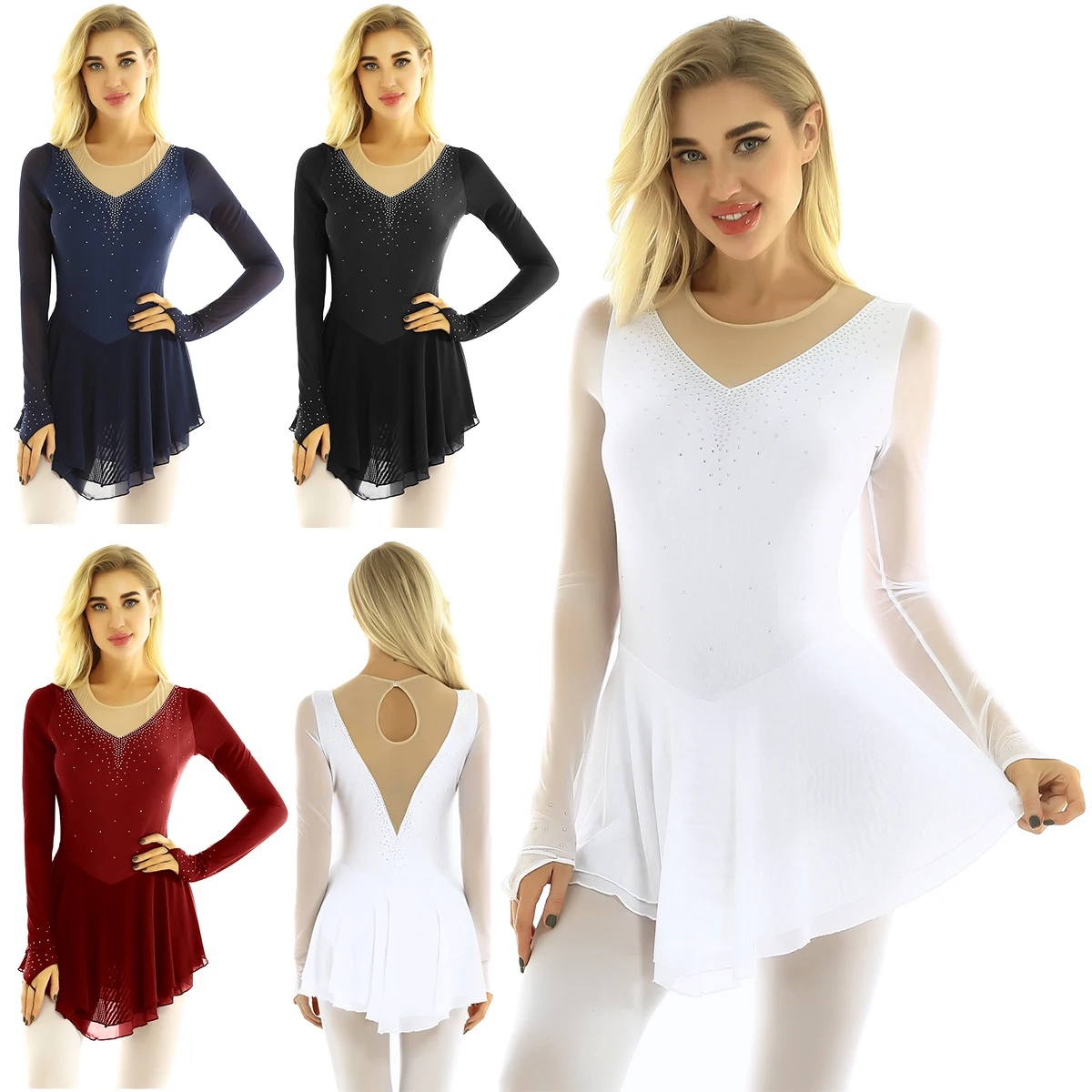 Women Shiny Rhinestone Figure Ice Skating Dress Roller Skating Ballet Dance Leotard Dress Round Nec