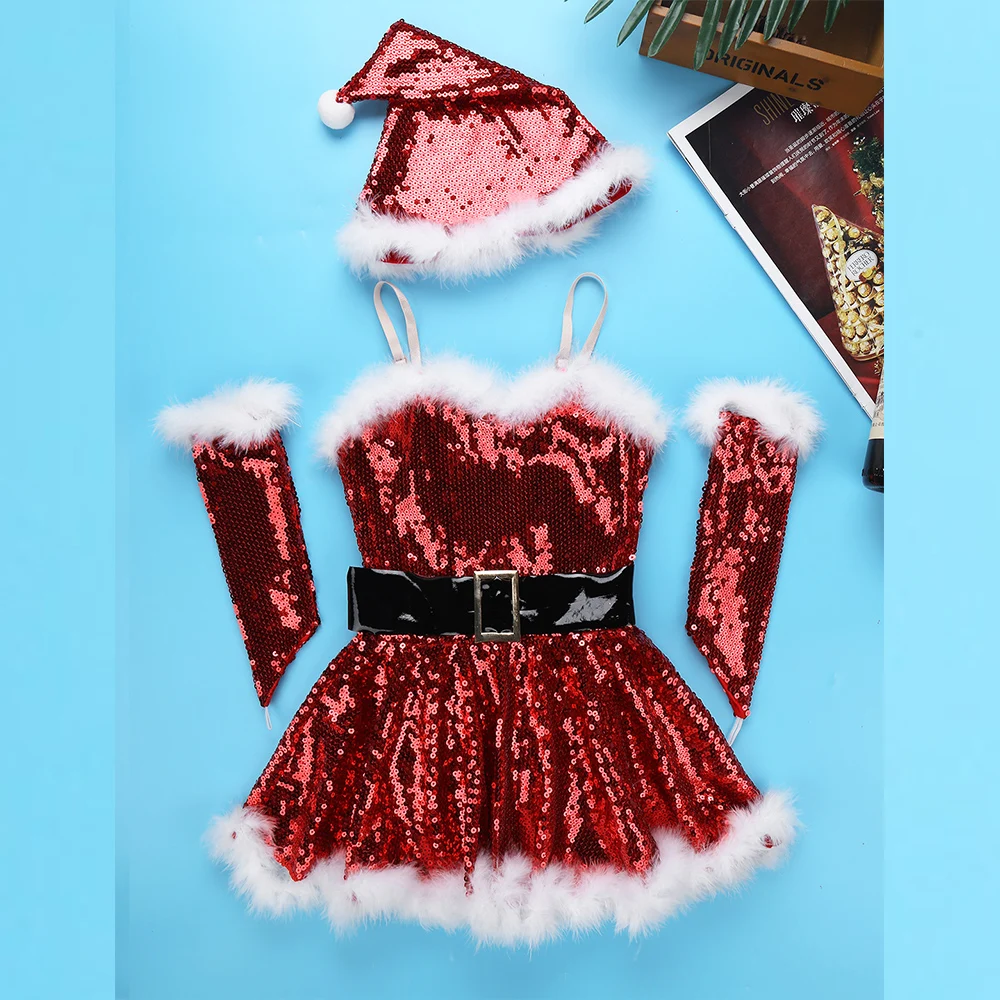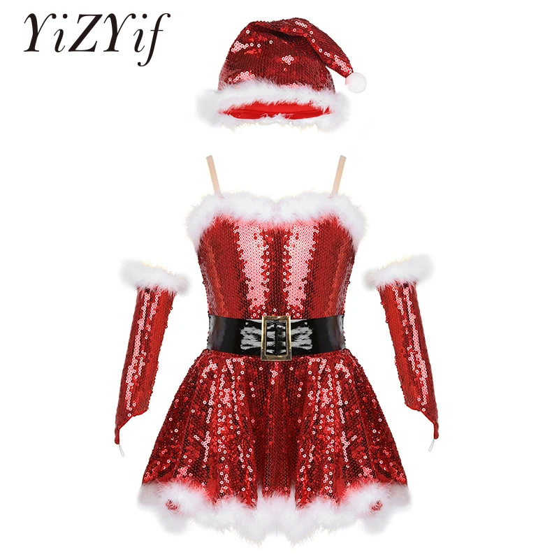 Kids Girls Fancy Party Christmas Santa Dance Costume Sequins Figure Ice Skating Dress Roller Skatin